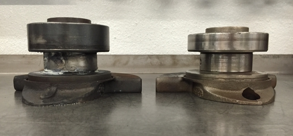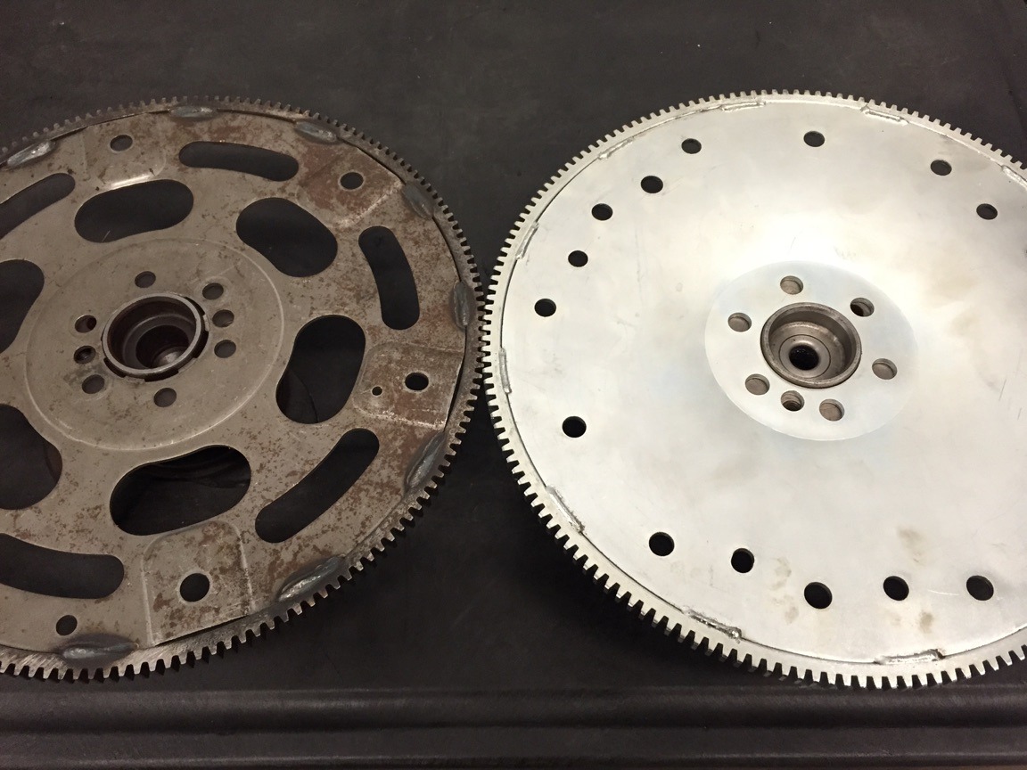 The following picture shows the flat flexplate sitting on a long crank (left), and the dished flexplate sitting on a short crank (right). Notice that the total offset of each combo is the same: